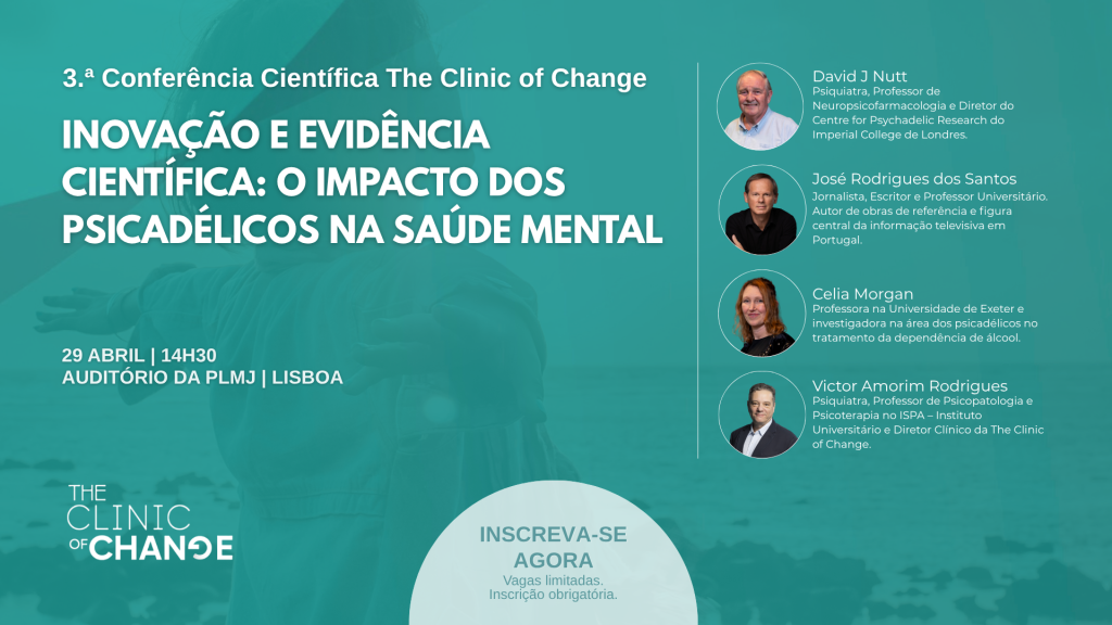 No próximo dia 29 de abril, realiza-se a 3.ª Conferência Científica The Clinic of Change, evento que é já uma referência na apresentação e discussão de progressos em torno do estudo dos psicadélicos e dos seus efeitos na saúde mental.
